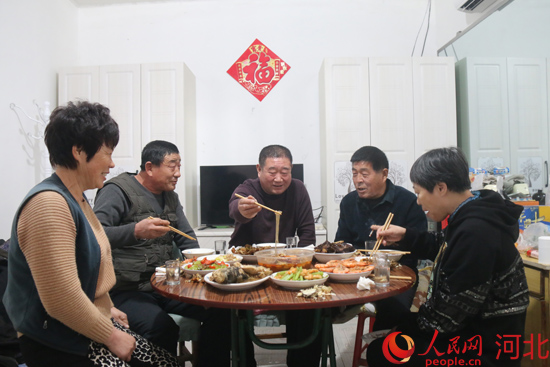 李軍與趙鳳潮、王會平等人在一起吃團(tuán)圓飯。裴信民攝