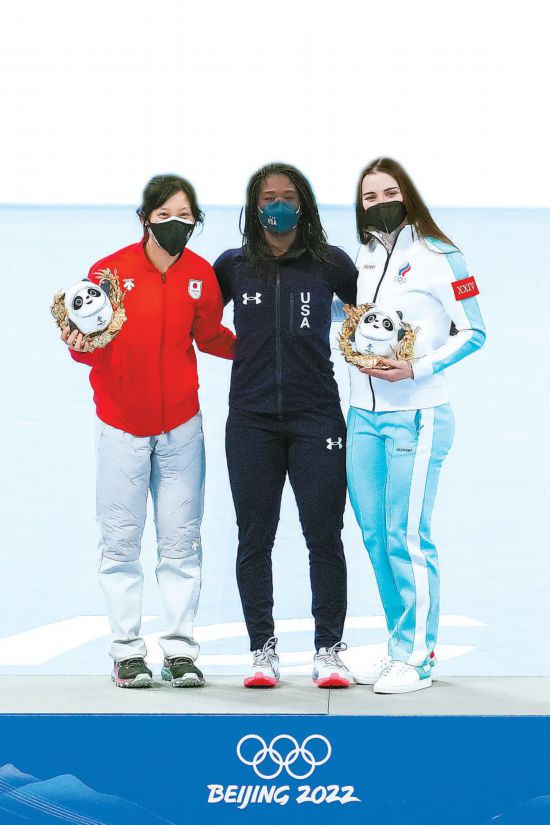 2月13日,北京2022年冬奧會(huì)速度滑冰女子500米決賽冠亞季軍選手合影。本報(bào)記者 鄧偉攝