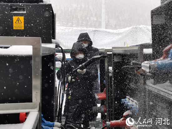 暴雪中,國網(wǎng)冀北電力場(chǎng)館電力保障隊(duì)員來到云頂滑雪公園巡視供電設(shè)備。 欒志成攝