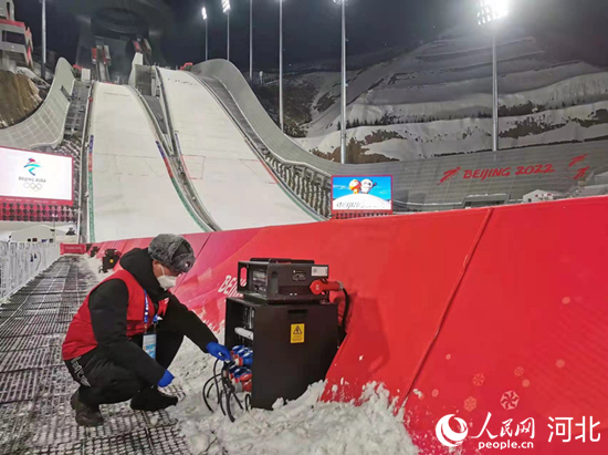國家跳臺(tái)滑雪中心電力保障團(tuán)隊(duì)在賽事后檢查用電設(shè)備。 韓寶喜攝
