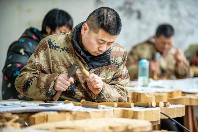 2月16日,金華東陽(yáng)市一木雕工坊里,工匠在專(zhuān)心制作大型木雕作品。春節(jié)過(guò)后,東陽(yáng)木雕企業(yè)紛紛開(kāi)工生產(chǎn)趕訂單。(胡肖飛)