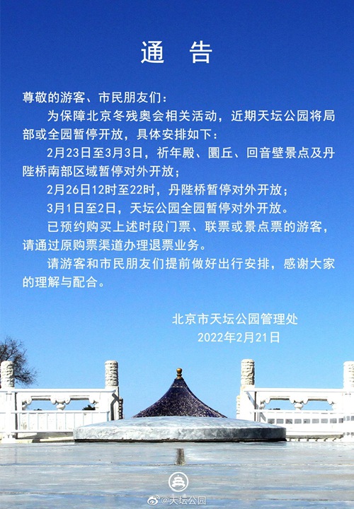 人民網(wǎng)北京2月22日電 2月21日,天壇公園管理處發(fā)布通告稱,為保障北京冬殘奧會(huì)相關(guān)活動(dòng),近期天壇公園將局部或全園暫停開(kāi)放。