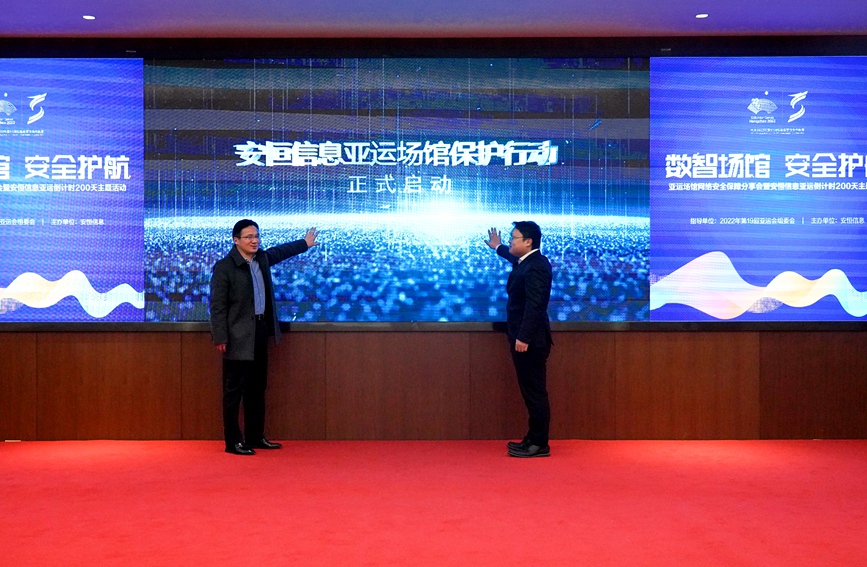 人民網(wǎng)杭州2月23日電 (張麗瑋)今天,杭州亞組委廣播電視和信息技術(shù)部副部長(zhǎng)趙欣浩與安恒信息高級(jí)副總裁袁明坤共同啟動(dòng)了“亞運(yùn)場(chǎng)館網(wǎng)絡(luò)安全保護(hù)行動(dòng)”。