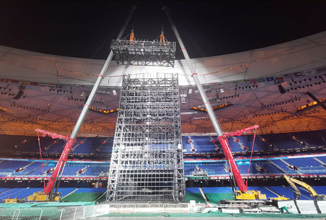 矗立在“鳥巢”東側(cè)跑道中心區(qū)域的巨幅屏幕被稱為“冰瀑”,由鋼結構和LED顯示屏組成,在開幕式上呈現(xiàn)了“黃河之水天上來”的震撼效果。拆除大屏幕主體鋼結構成為“鳥巢”轉(zhuǎn)場的關鍵。