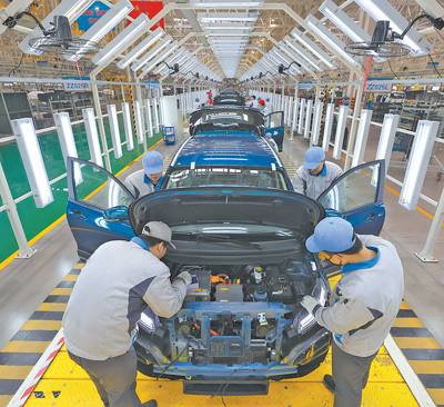 工作人員在山西運城一家汽車制造企業(yè)的總裝車間作業(yè)。