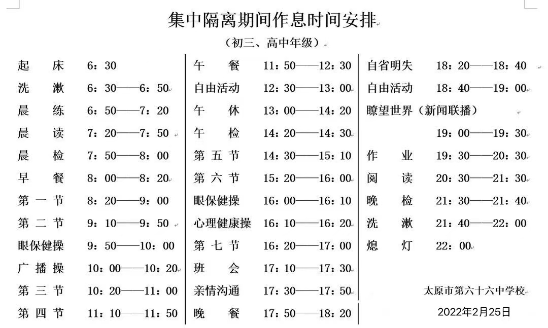 六十六中位于太原市尖草坪區(qū)迎新街迎新東二條,有兩棟教學(xué)樓,分別為初中部與高中部,是一所完全中學(xué)。為了最大程度保證正常教學(xué)秩序,學(xué)校在當(dāng)天就開(kāi)始制定作息時(shí)間表,根據(jù)學(xué)生不同年齡段的特點(diǎn),分年級(jí)安排部署了隔離期間師生的學(xué)習(xí)與生活。