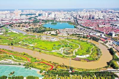 2021年10月12日拍攝的滄州市百獅園生態(tài)修復(fù)區(qū)。滄州市百獅園生態(tài)修復(fù)區(qū)原是大運(yùn)河沿線的兩個城中村,目前已成為城市內(nèi)一道靚麗的風(fēng)景線。(資料片)新華社發(fā)