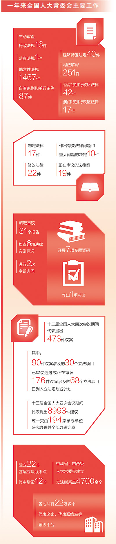 一年來,全國(guó)人大常委會(huì)制定法律17件,修改法律22件,作出有關(guān)法律問題和重大問題的決定10件,正在審議的法律案19件。