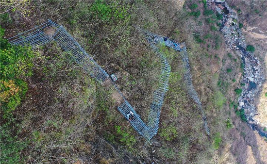 在四川省涼山彝族自治州昭覺(jué)縣阿土列爾村的懸崖鋼梯上,村民沿著鋼梯下山(2020年5月13日攝)。新華社記者 王曦 攝