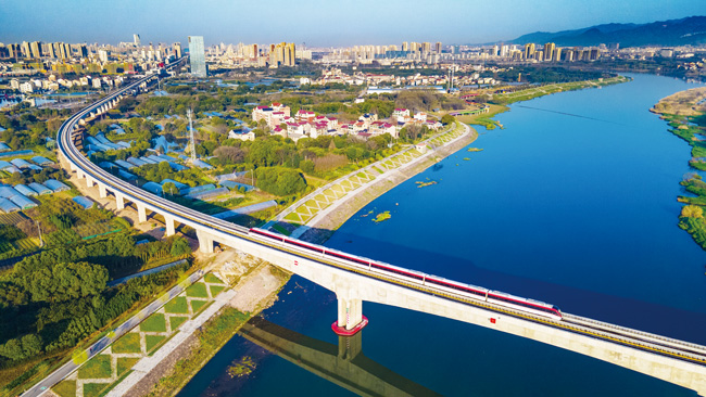 3月12日早晨,金華金義東市域軌道交通一列電客車疾馳而過,穿過金東區(qū)跨東陽江大橋,駛向下一站——金華南站,河道兩岸,綠油油的田野、遠(yuǎn)處林立的高樓連片交織,組成一幅春天絢麗多彩的圖畫。(時(shí)寬兵)