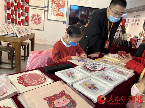 走進(jìn)展廳,樂亭皮影戲的表演贏得了場下陣陣掌聲,感興趣的小朋友在后臺體驗皮影戲。蔚縣剪紙、武強(qiáng)木版年畫、樂亭皮影戲雕刻展臺前圍著許多大人與小孩,他們積極參與,觸摸、體驗,聽非遺傳承人介紹背后的故事。