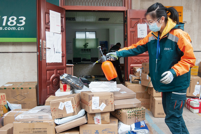 3月20日,在金華一快遞公司人民東路特快專遞攬投部,員工給快件和派送車輛噴灑藥水進(jìn)行消殺。據(jù)了解,為做好新冠疫情防控工作,運(yùn)載快件的大型車輛到達(dá)后,卸貨前先要對車輛消殺,再給快件消殺;快遞員每次出車派送返回?cái)埻恫?,都要按要求給車輛消殺。工作場地每天早、中、晚消殺3次,記錄在工作臺賬上。(時(shí)寬兵)