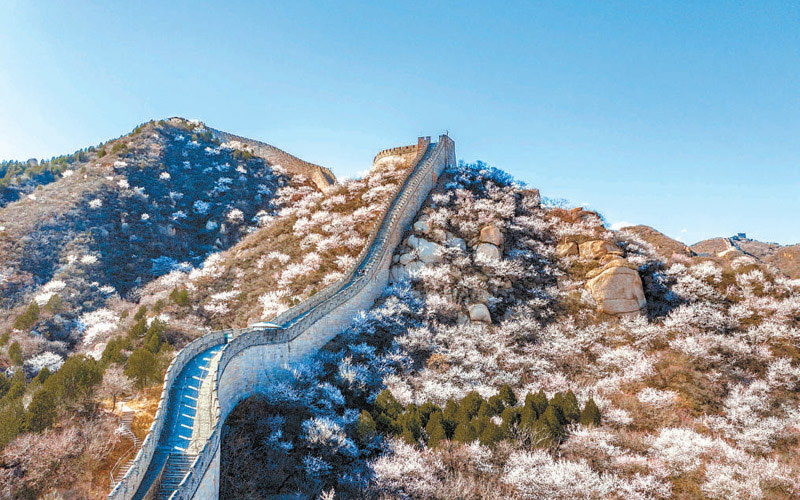 昨天天朗氣清,爛漫的山花將蜿蜒的水關(guān)長(zhǎng)城裝點(diǎn)得分外妖嬈。本報(bào)記者 潘之望攝