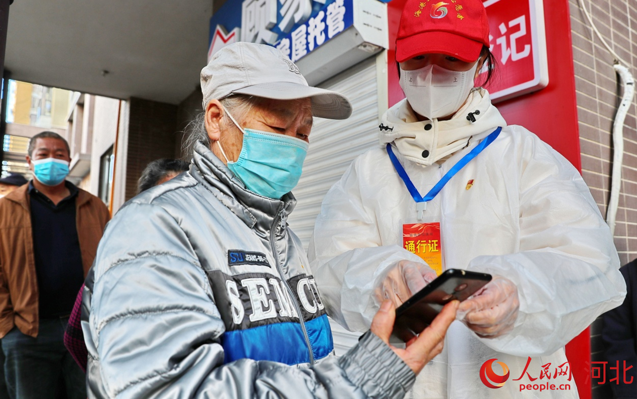 人民網(wǎng)石家莊3月27日電 “打開電子健康碼。”“保持好1米距離?!薄?月25日上午9點(diǎn),在河北秦皇島市海港區(qū)森林逸城小區(qū),秦皇島市委組織部黨員先鋒隊(duì)隊(duì)員董菁正在組織居民有序排隊(duì)做核酸檢測(cè),提醒大家準(zhǔn)備好電子健康碼,耐心指導(dǎo)不熟悉操作流程的居民。