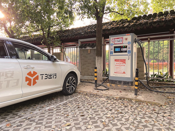 南京寶船聽濤廣場內,一輛新能源網約車正在充電。董翔 攝