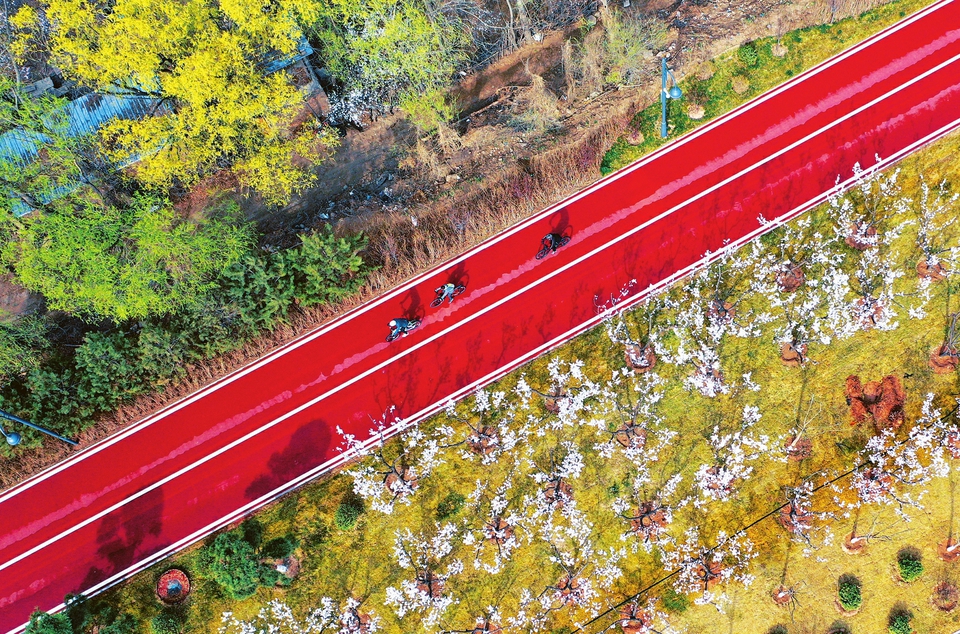4月6日,春光和煦,百花爭艷,在太原市汾河生態(tài)景觀濱河西路自行車道柴村橋以北,鳥瞰兩旁的杏花競相綻放,游人騎行漫步其中,聞淡雅花香,觀生態(tài)風(fēng)光,別有一番韻味。(記者劉通攝)