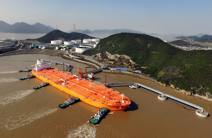 30萬噸巨型油輪靠泊岙山石油轉(zhuǎn)運(yùn)基地。中國(浙江)自由貿(mào)易試驗(yàn)區(qū)舟山管理委員會(huì)供圖