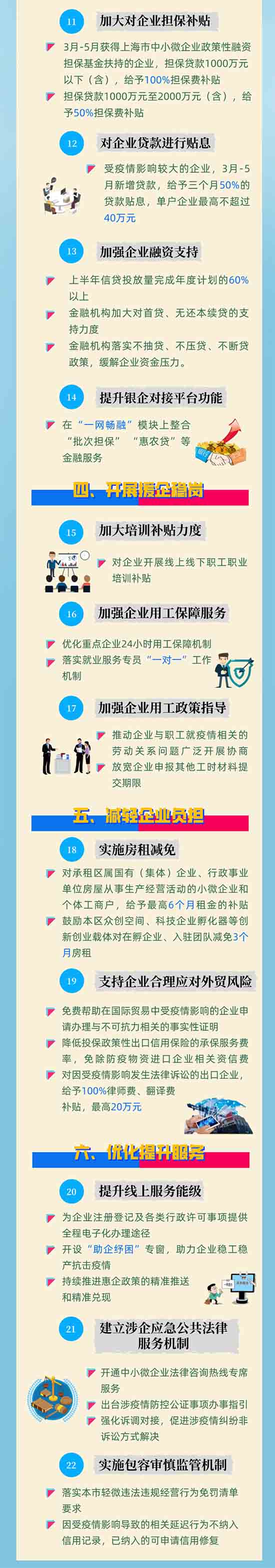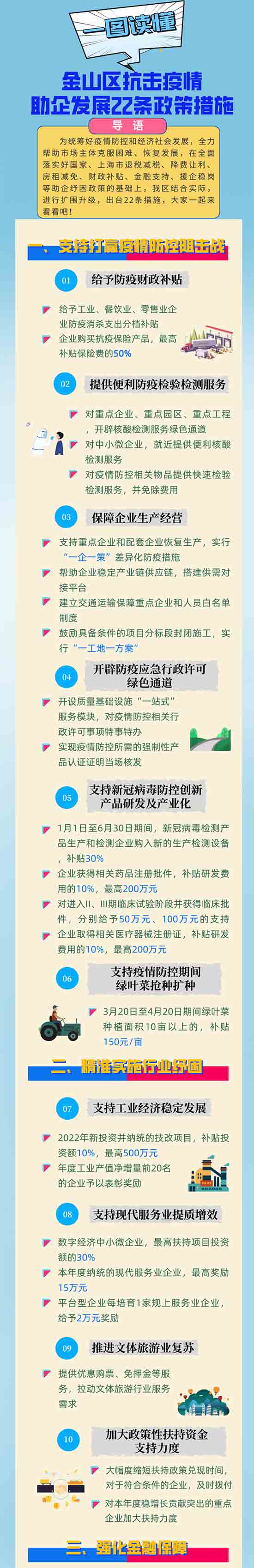 據(jù)悉,為統(tǒng)籌好疫情防控和經(jīng)濟社會發(fā)展,全力幫助市場主體克服困難、恢復發(fā)展,在全面落實好國家、上海市退稅減稅、降費讓利、房租減免、財政補貼、金融支持、援企穩(wěn)崗等助企紓困政策的基礎上,結合金山實際,進行擴圍升級,制訂《金山區(qū)抗擊疫情助企發(fā)展22條政策措施》?!?2條”既聚焦企業(yè)當前面臨的“難點”“痛點”“堵點”,又考慮到疫情后企業(yè)加快發(fā)展的各項訴求,共計包括六大方面內(nèi)容,即支持打贏疫情防控阻擊戰(zhàn)、精準實施行業(yè)紓困、強化金融保障、開展援企穩(wěn)崗、減輕企業(yè)負擔及優(yōu)化提升服務,用實實在在的舉措,精準幫助市場主體紓困解難,穩(wěn)定經(jīng)濟增長。