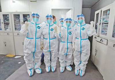 4月8日晚,隨著海南省援滬醫(yī)療隊(duì)近百名醫(yī)護(hù)人員的進(jìn)駐,上海嘉定南翔方艙醫(yī)院正式投入運(yùn)行。圖為醫(yī)護(hù)人員在入艙前加油鼓勁。新華社記者 李 賀攝