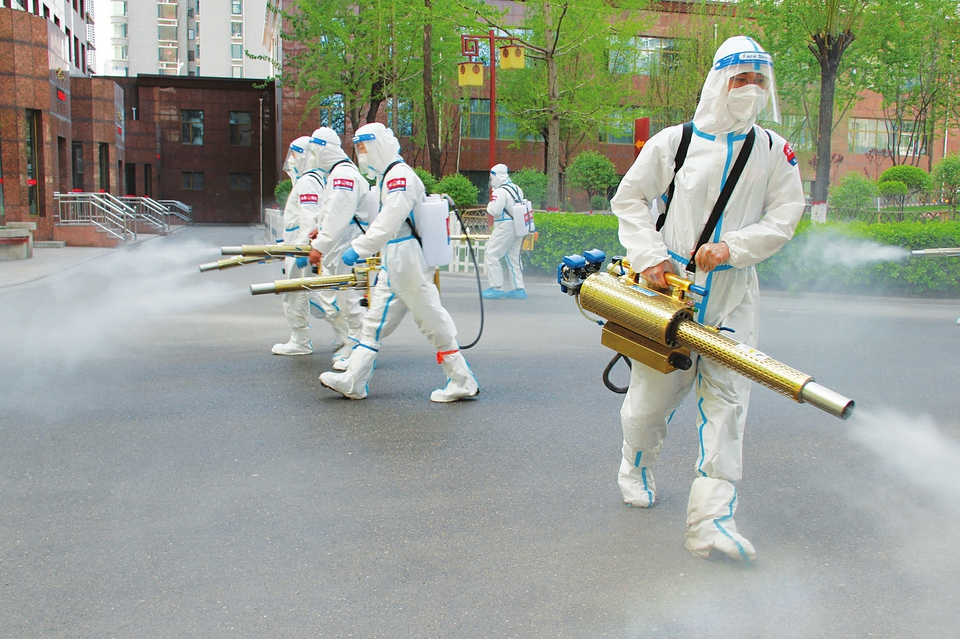 4月12日,在小店區(qū)千禧學(xué)府苑小區(qū),太原市應(yīng)急管理綜合行政執(zhí)法支隊的消殺隊員們正在消殺。隨后他們來到西吳村社區(qū)、丁香園、恒大綠洲、長風(fēng)小區(qū)等居民住宅區(qū),對所有樓棟、垃圾點及室外公共區(qū)域等進行全面消殺,牢牢筑起健康防線。(記者尤麗云攝)