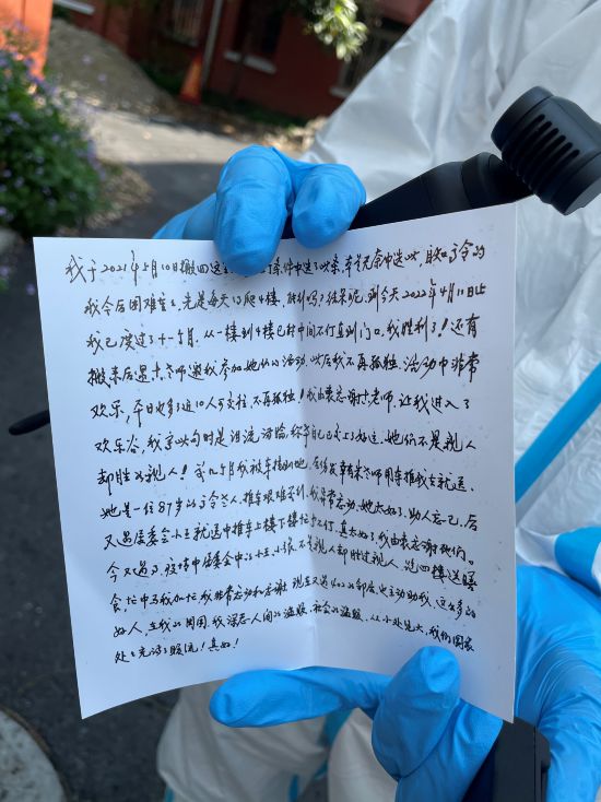 幾經(jīng)推辭,錢留在老人家手里,但她還執(zhí)拗地遞來兩封信,一封短的,本來包鈔票用的:這是給您們和廣大志愿者添些營養(yǎng)品用,望勿拒。還有封長信里提到,“疫情中,居委會的小王、小張,不是親人卻勝過親人,跑四樓送膳食,我非常感謝?!?/p>
