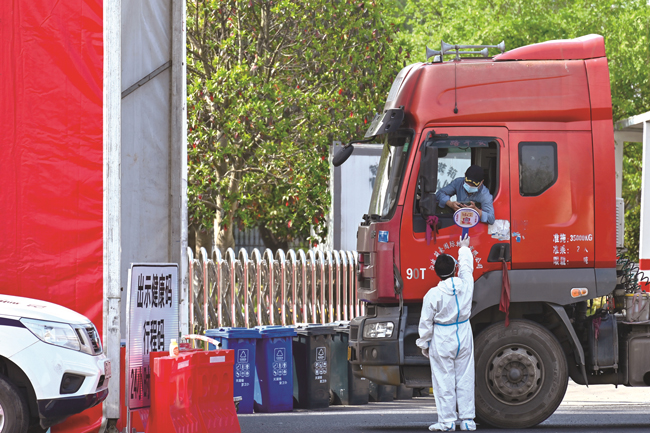 4月21日,在嘉興市嘉善縣天凝高速出入口,交警正在核驗過往司乘人員的健康碼、行程卡、核酸檢測報告和有無途經中高風險地區(qū)等信息,筑牢疫情防線,保障物流安全暢通。(張啟帆)