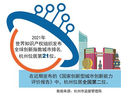 2021年以來,杭州知識產權工作堅持以數字化改革為引領,以推動高質量發(fā)展為目標,著力完善體系,持續(xù)協(xié)同發(fā)力,為高質量發(fā)展建設共同富裕示范區(qū)城市范例提供了有力支撐。截至2021年底,杭州市有效發(fā)明專利擁有量9.5萬件,居全國省會城市第一,其中,高價值發(fā)明專利39842件,占比41.9%;杭州市有效注冊商標102.56萬件,居全國省會城市第二;2021年浙江省設區(qū)市知識產權保護工作考核優(yōu)秀,位居第一;2021年世界知識產權組織發(fā)布全球創(chuàng)新指數城市排名,杭州位居第21位;在近期發(fā)布的《國家創(chuàng)新型城市創(chuàng)新能力評價報告》中,杭州位居全國第二位。