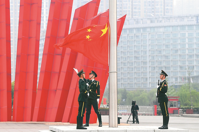 鮮艷的五星紅旗緩緩升起,迎著江風(fēng)高高飄揚(yáng)。 本報記者 萬程鵬 攝