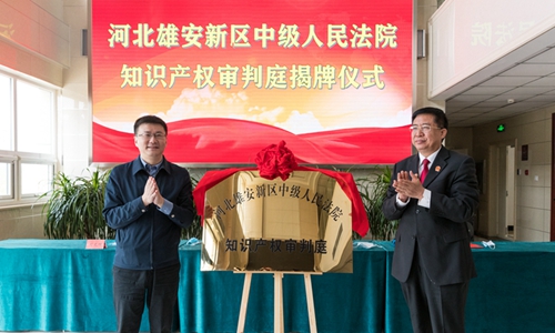 河北雄安新區(qū)中級(jí)人民法院知識(shí)產(chǎn)權(quán)審判庭揭牌儀式現(xiàn)場(chǎng)。 雄安中院供圖