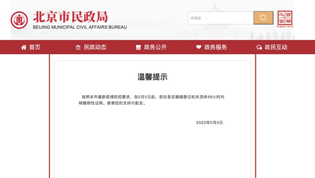 人民網(wǎng)北京5月7日電 據(jù)北京市民政局官網(wǎng)消息,按照北京市最新疫情防控要求,自5月5日起,前往各區(qū)婚姻登記機關(guān)須持48小時內(nèi)核酸陰性證明。