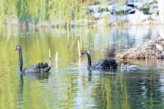 3月29日,圓明園九州景區(qū)后湖里,一對黑天鵝寶寶成功孵化,兩只小天鵝立即成為圓明園新寵,吸引了眾多攝影愛好者前來拍攝。黑天鵝一家在湖中時而靜靜游動,時而將頭扎進水中覓食,映襯著一湖碧水和如煙的拂柳,構成一幅絕美的自然畫面。湖邊還有一只黑天鵝正在孵蛋育雛,周邊放置的警戒線幫助黑天鵝安全育雛。游客們也只是遠遠地靜靜地看看,生怕驚擾了這“一家人”。