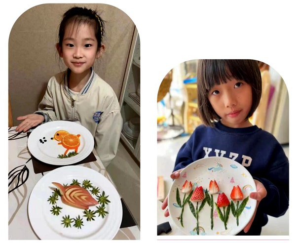 黑芝麻胡同小學(xué)學(xué)生展示和家長一起制作的水果拼盤