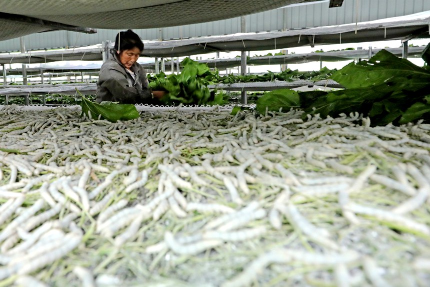 村民在給蠶喂食桑葉。何江華攝