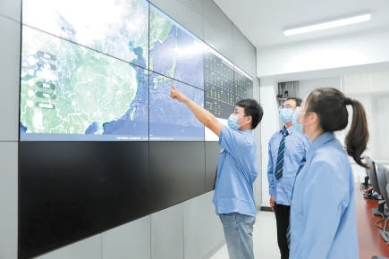 調度指揮中心人員利用衛(wèi)星云圖進行“觀云追雨”分析和降雨量的研判。