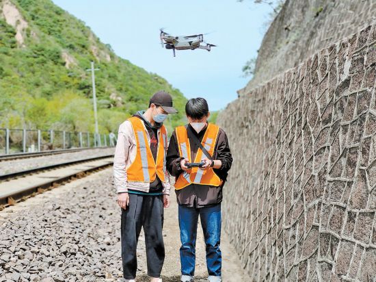 北京工務段職工利用無人機對高大山體等防洪處所進行隱患排查。