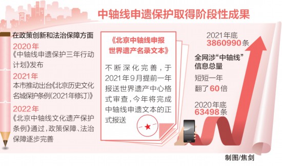 2017年,“積極推進(jìn)中軸線申遺工作”寫入《北京城市總體規(guī)劃(2016年—2035年)》。同年,北京市推進(jìn)全國文化中心建設(shè)領(lǐng)導(dǎo)小組批準(zhǔn)成立了中軸線申遺保護(hù)專項(xiàng)工作組,全面啟動北京中軸線申遺保護(hù)工作……
