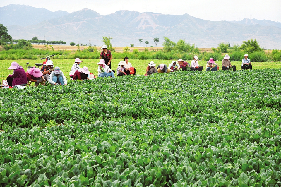 6月1日,聞喜縣后宮鄉(xiāng)新陽莊村村民正在收割大田菠菜,準(zhǔn)備發(fā)往市場(chǎng)。
