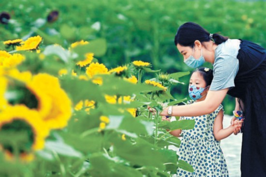 昨天,奧林匹克森林公園北園西門(mén)附近的“花田野趣”景區(qū),部分品種的向日葵競(jìng)相綻放,吸引不少市民前來(lái)打卡拍照。 本報(bào)記者 程功攝