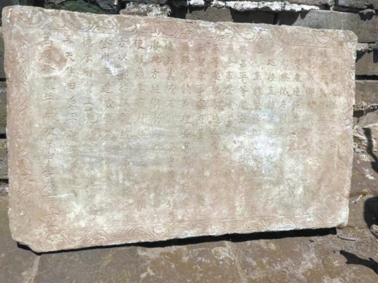 “發(fā)現(xiàn)一塊石碑,出土時碑文一面向下,推測這塊石碑原來鑲嵌在北側(cè)垛口墻內(nèi)側(cè),墻體傾斜倒塌后,石碑脫落?!表椖靠脊咆撠熑恕⒈本┛脊叛芯吭焊毖芯繂T尚珩介紹。石碑為青石材質(zhì),保存完整,邊框刻著纏枝卷草紋。因為脫落時碑文面朝下,因此碑文保存完好,字體為繁體字,字跡娟秀,清晰可辨。