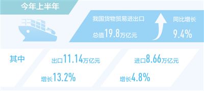 本報北京7月13日電?。ㄓ浾叨藕?jù)海關(guān)統(tǒng)計,今年上半年我國貨物貿(mào)易進出口總值19.8萬億元,同比增長9.4%。其中,出口11.14萬億元,增長13.2%;進口8.66萬億元,增長4.8%。