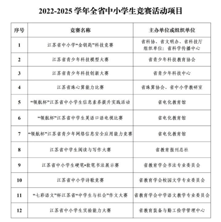 江蘇公布2022-2025學年中小學生競賽活動項目