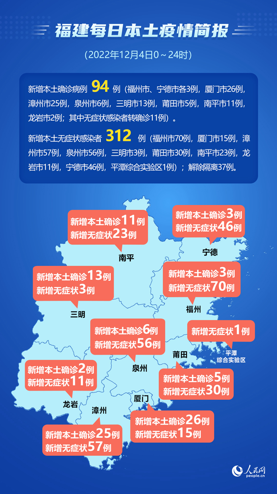 人民網(wǎng)福州12月5日電 (易雪妍、陳永整)據(jù)福建省衛(wèi)健委網(wǎng)站消息,12月4日0~24時,福建省報告新增本土確診病例94例(福州市、寧德市各3例,廈門市26例,漳州市25例,泉州市6例,三明市13例,莆田市5例,南平市11例,龍巖市2例;其中無癥狀感染者轉(zhuǎn)確診11例)。當日報告新增本土無癥狀感染者312例(福州市70例,廈門市15例,漳州市57例,泉州市56例,三明市3例,莆田市30例,南平市23例,龍巖市11例,寧德市46例,平潭綜合實驗區(qū)1例);解除隔離37例。