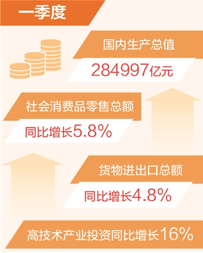 國內(nèi)需求逐步擴(kuò)大。一季度,社會消費(fèi)品零售總額同比增長5.8%,服務(wù)零售額保持兩位數(shù)增長。一季度,固定資產(chǎn)投資同比增長5.1%,與上年全年持平。