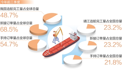 今年前三季度,我國(guó)造船完工量、新接訂單量和手持訂單量以載重噸計(jì)分別占全球總量的48.7%、68.5%和54.7%,均居世界第一。在江蘇泰州靖江市,當(dāng)?shù)卦齑髽I(yè)的訂單排到了2026年,成為我國(guó)船舶業(yè)轉(zhuǎn)型升級(jí)、穩(wěn)步向好的縮影。