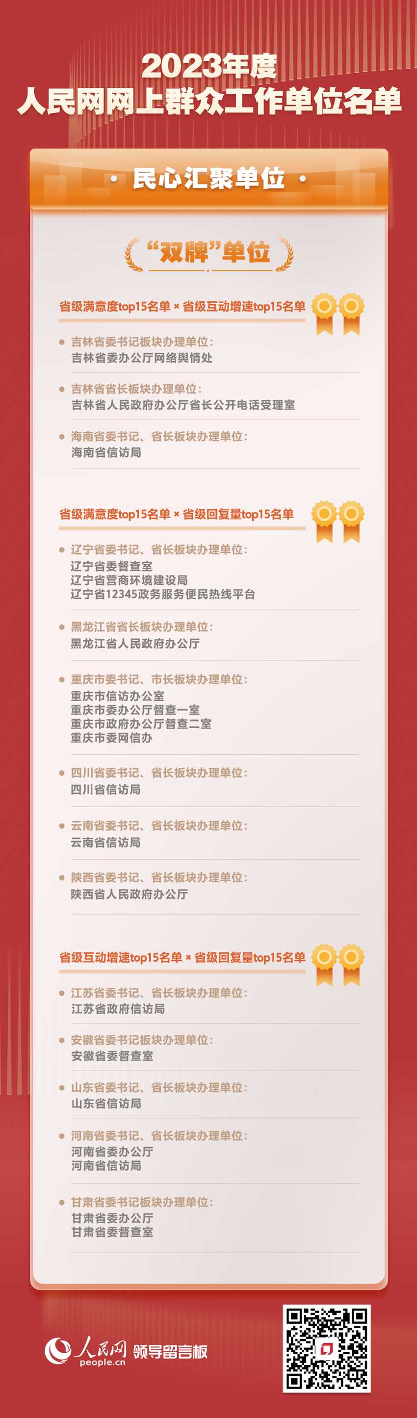 此次公布的名單綜合全國各地區(qū)各部門各單位近一年來的滿意度、互動(dòng)增速、回復(fù)量等指數(shù),著重突出各地區(qū)各部門各單位依托人民網(wǎng)“領(lǐng)導(dǎo)留言板”開展網(wǎng)上群眾工作情況,選出2023年度人民網(wǎng)網(wǎng)上群眾工作“民心匯聚單位”“實(shí)干擔(dān)當(dāng)單位”“匯智為民單位”和“活力奮進(jìn)單位”。