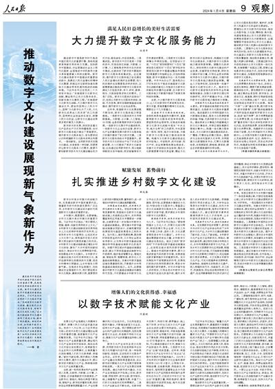 建設(shè)數(shù)字中國是數(shù)字時(shí)代推進(jìn)中國式現(xiàn)代化的重要引擎,是構(gòu)筑國家競(jìng)爭(zhēng)新優(yōu)勢(shì)的有力支撐。數(shù)字文化建設(shè)是數(shù)字中國建設(shè)的重要組成部分。習(xí)近平總書記在黨的二十大報(bào)告中指出:“實(shí)施國家文化數(shù)字化戰(zhàn)略,健全現(xiàn)代公共文化服務(wù)體系,創(chuàng)新實(shí)施文化惠民工程?!边@為我們推進(jìn)數(shù)字文化建設(shè)指明了前進(jìn)方向、提供了根本遵循。新時(shí)代新征程,如何提升數(shù)字文化服務(wù)能力?如何推動(dòng)數(shù)字文化產(chǎn)業(yè)高質(zhì)量發(fā)展?如何扎實(shí)推進(jìn)鄉(xiāng)村數(shù)字文化建設(shè)?本期觀察版圍繞這些問題進(jìn)行探討。