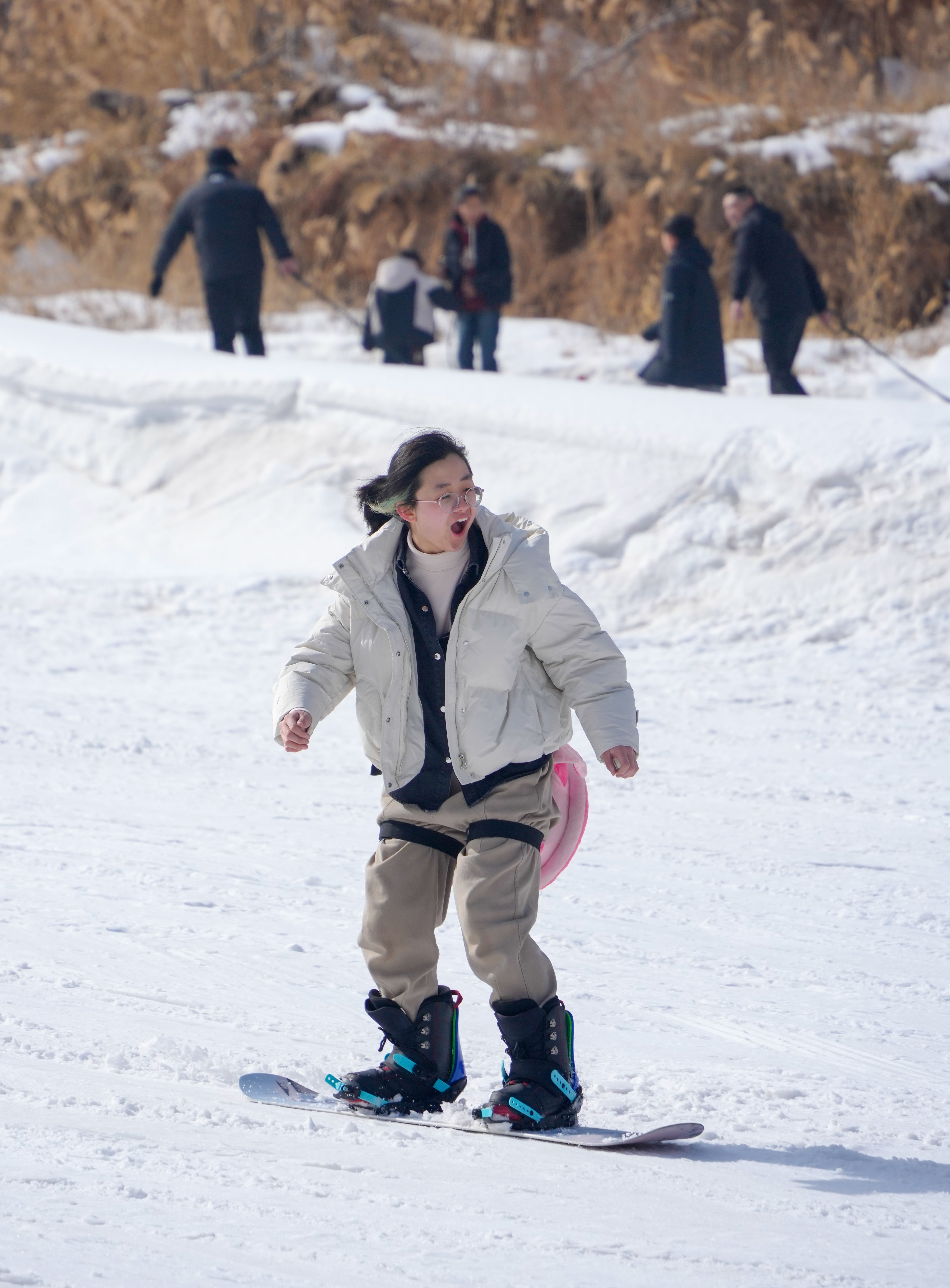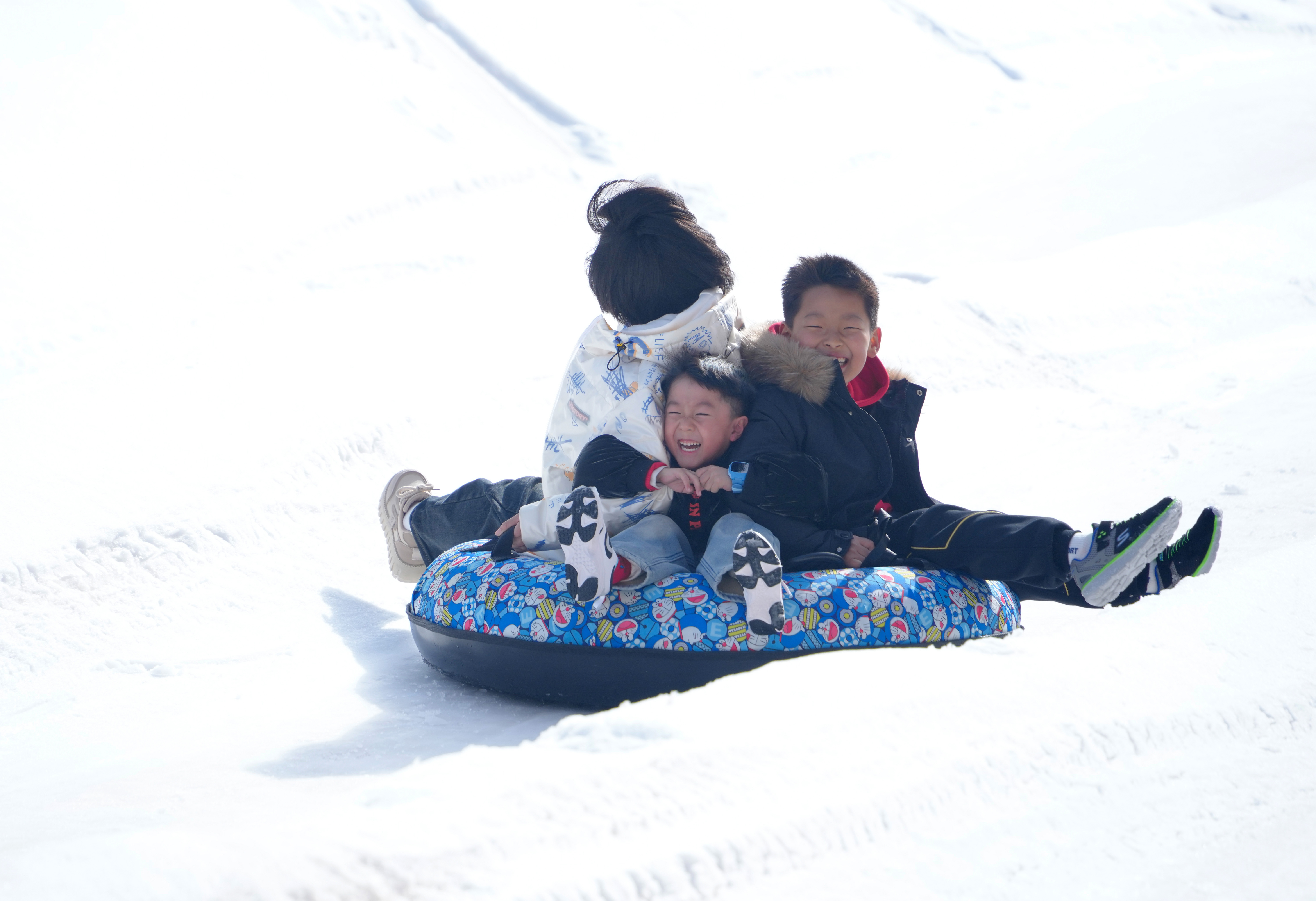 從滑雪坡上乘滑雪圈疾馳而下,大朋友、小朋友“全副武裝”盡情撒歡,游客們?cè)诒┻\(yùn)動(dòng)中增強(qiáng)體質(zhì),樂享春節(jié)假期生活。(閆鑫 攝)