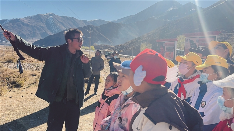 小朋友們在保護(hù)中心工作人員李義旺的帶領(lǐng)下了解雪豹生存環(huán)境。