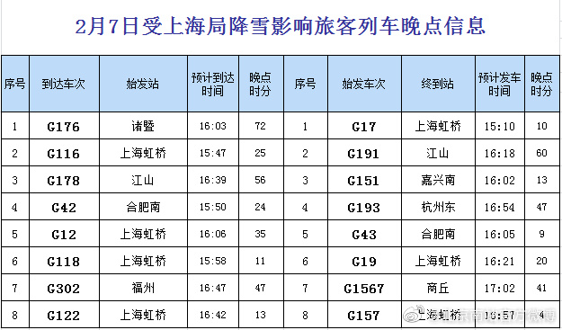 據(jù)@北京南站官方微博消息,受上海局降雪影響,北京南站京滬高鐵部分到達(dá)、始發(fā)列車有不同程度晚點。截至目前,具體晚點情況信息如下,請廣大旅客及時關(guān)注12306官方信息和車站公告。