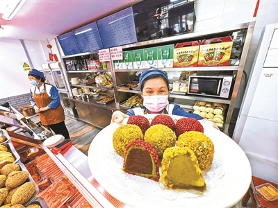 此外,北京稻香村各門店、護國寺小吃等多家門店,都為京城百姓準(zhǔn)備了各色口味的青團。在位于東直門內(nèi)大街的北京稻香村“東城食尚店”里,一位女士正在選購著青團,她表示今天是特意來買北京稻香村新推出的青團小禮盒的,周末踏青時正好帶上與朋友分享。